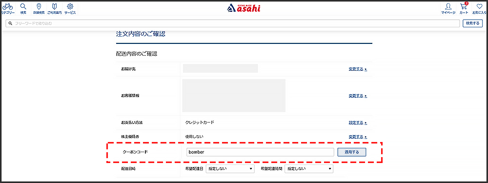 - 2.対象商品をカートに入れ、必要事項を記入、「注文内容のご確認」画面の「クーポンコード」にクーポンコードを入力ください。